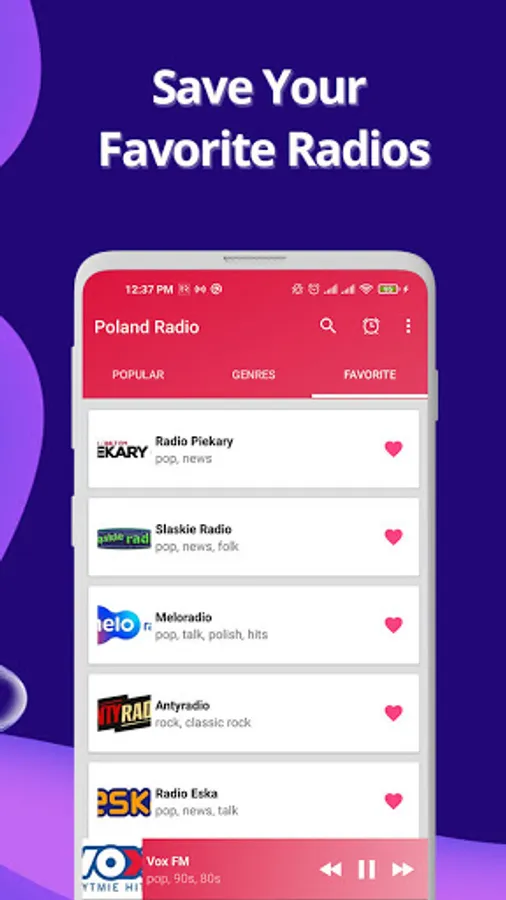 Radio Poland is an android radio application where you can listen different fm online broadcasted from every online radio stations of Poland. It helps you to find different fm online radios in different language as well. Apart from the radio player, this application let you to enjoy with soothing music from different radio so this is also a music player application.
