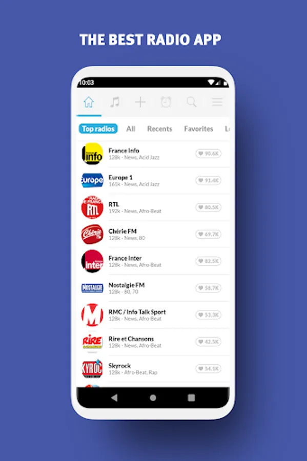 It's simple, efficient and fast, our radio player is ideal for listening live to the most popular radio stations in France like France Info, RFI Monde, Chérie, RTL, Fun, RMC, Nostalgie, NRJ HITS, Rire et Chansons, Classique, Skyrock, B Business, Virgin, LATINA, 100 % Français R and many other radio stations to discover thanks to our suggestions regularly updated.