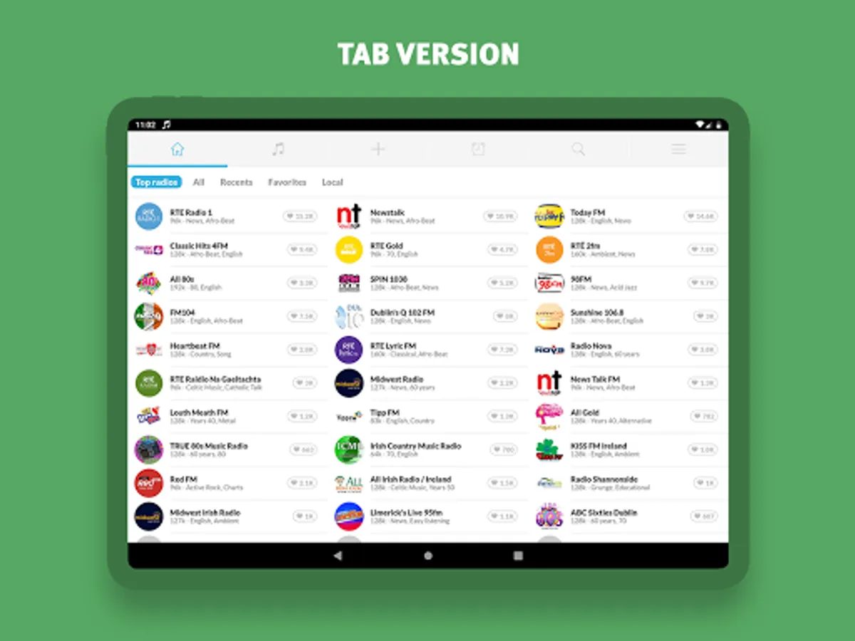 It's simple, efficient and fast, our radio player is ideal for listening live to the most popular radio stations in Ireland like RTE, News Talk, Today, Classic Hits Ireland, Irish Pub, SPIN 1038, Heartbeat, Dublin s Q 102, Red, Midwest, Nova, All 80s, Sunshine 106.8, Galway Bay, Christmas North Pole and many other radio stations to discover thanks to our regularly updated suggestions.