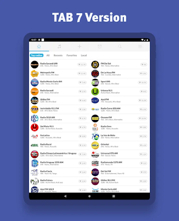 It's simple, efficient and fast, our radio player is ideal for listening live to the most popular radio stations from Uruguay like Azul 101.9, Sport 890, Metropolis, Inolvidable, Sarandí 690, Universal 970, Carve 850, Disney Latinoérica, Monte Carlo, 1010, De La Nuca, Del Plata 95.5, El Espectador, Aire 100.3, Oceano and many other radio stations to discover thanks to our regularly updated suggestions.