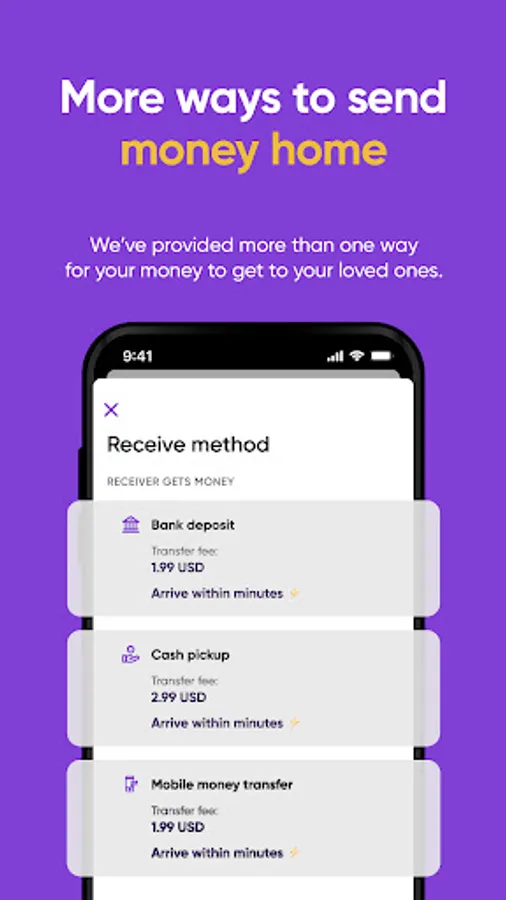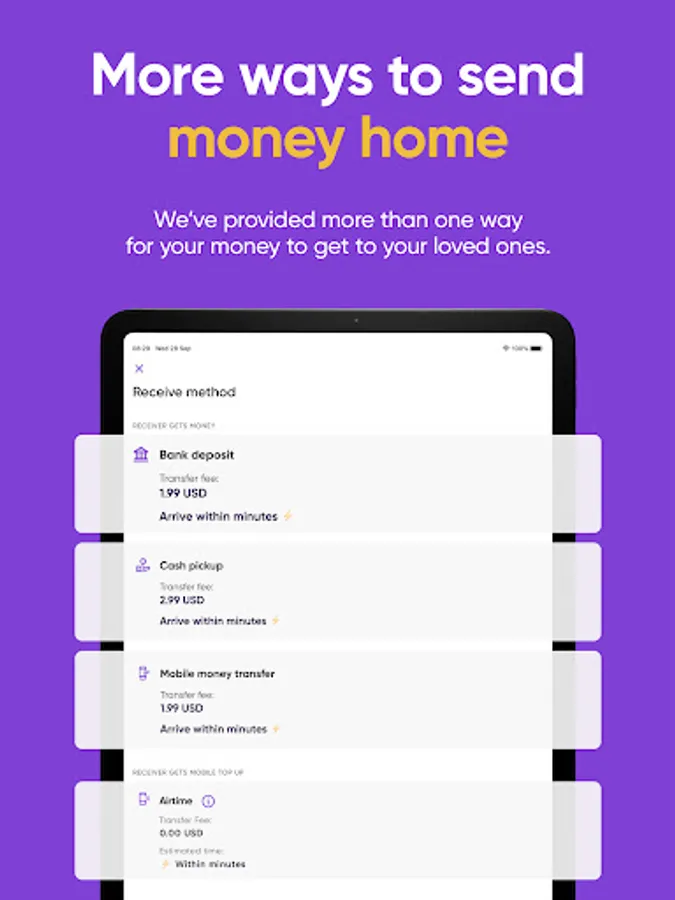 Depending on where you're sending to - the app offers you a choice of ways to transfer money; cash pickup, mobile money, bank transfer and airtime top up.