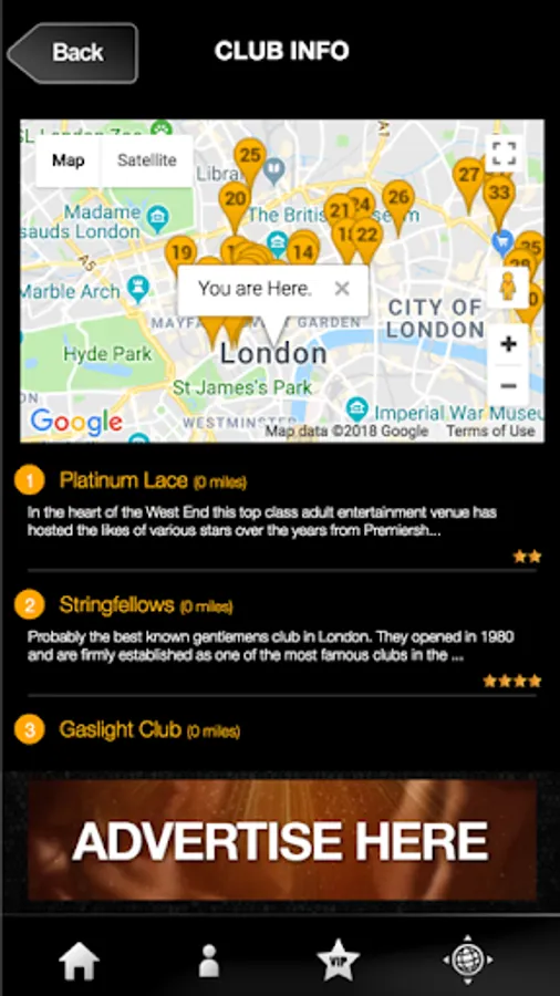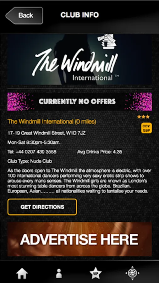 VIP Clubs are highlighted with a yellow gradient background and a star VIP icon - once you click through to the club page you have much more information about the club and buttons that show you the current offers and the get direction to find the easiest and quickest way to get there.