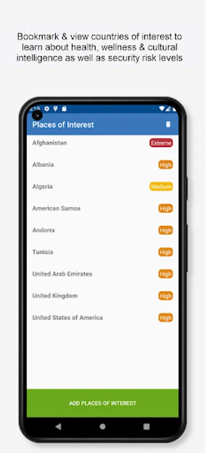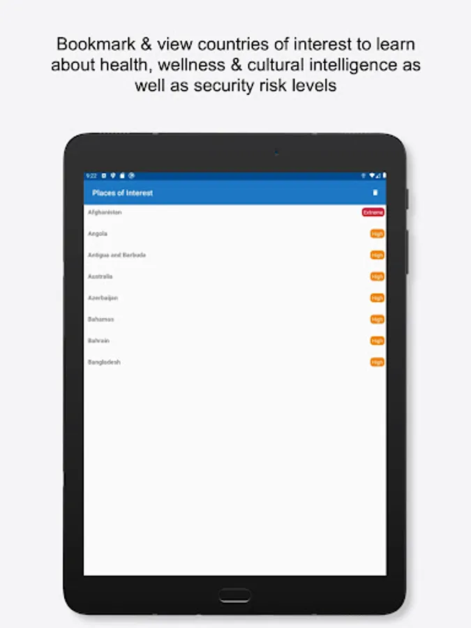 - follow countries you're interested in to learn about health, wellness & cultural intel as well as the security risk level.