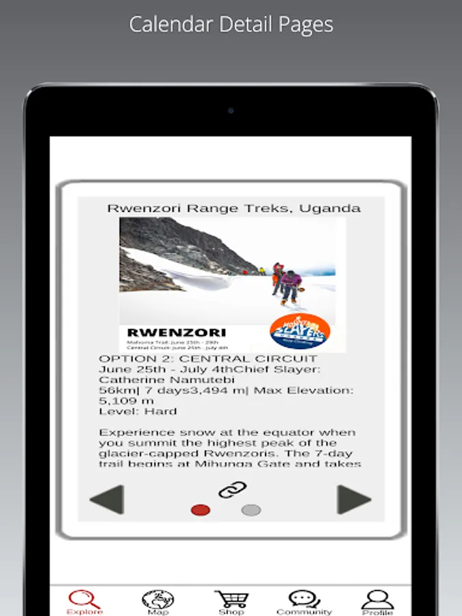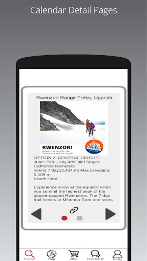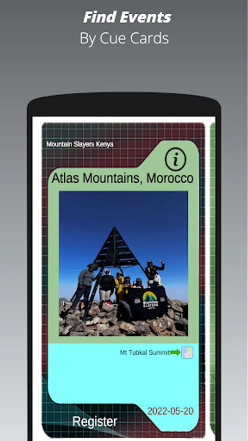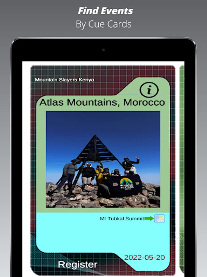 The app is about finding and exploring outdoor events by World Map (filtered pins), Cue Cards (arranged in different ways and with data and pictures) and by Calendar. The events can be separated by Organization/Clubs so that you find the type of activity you want and in the geographical areas of interest.