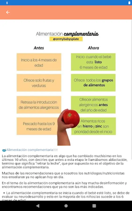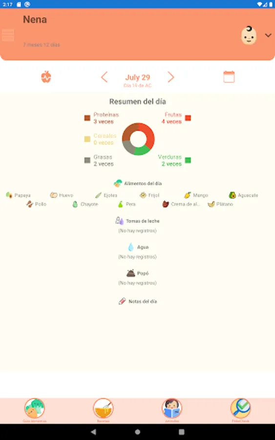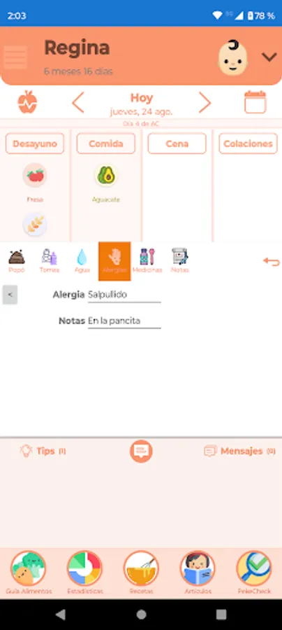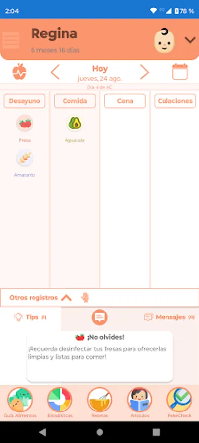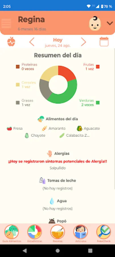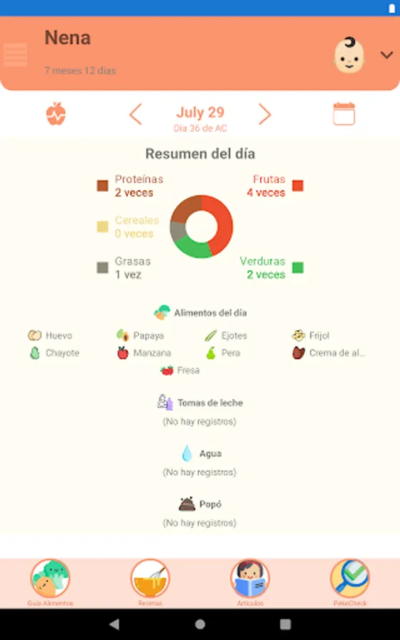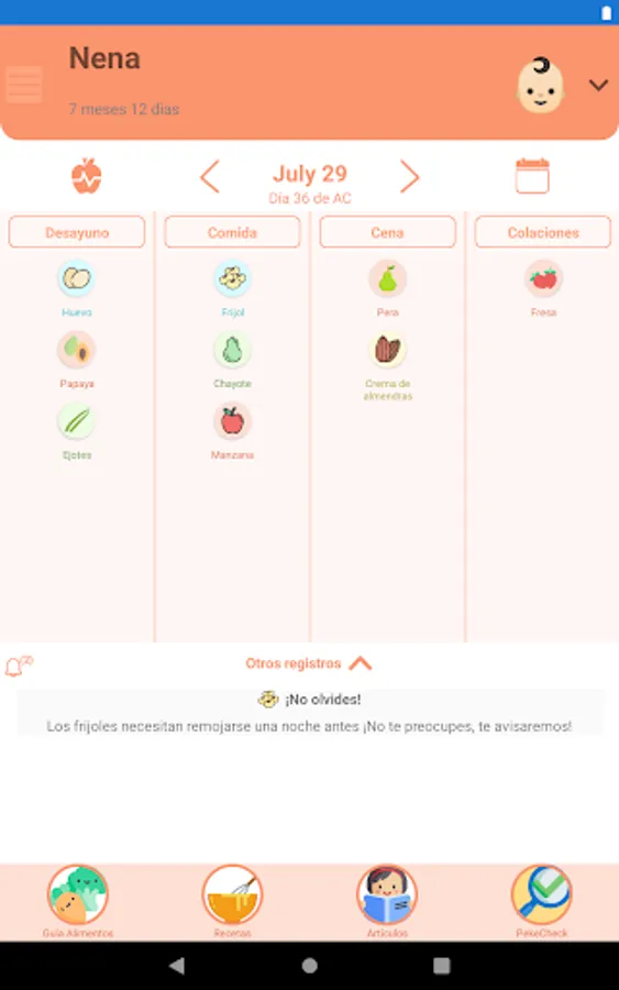 In PekeBocados you will find tools to make this process easy and safe. Find out how to safely present each food, according to the BLW or Traditional method, whichever you prefer. Record what your baby has eaten, and if he has exhibited any allergy symptoms. How did you poop? Have you had water? Take daily notes for your pediatrician or child nutritionist. Let PekeBocados help you and live the great experience of starting with solid foods.