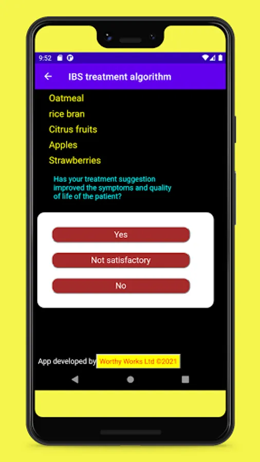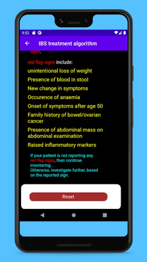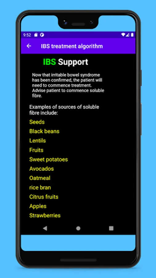 Simply laid out, it works the user through pieces of advice (based on international medical guidelines) and investigations to undertake and before settling to confident treatment of IBS.