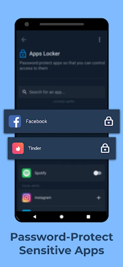 The mobile app locker lets you lock apps with a custom password to avoid others having access to them, increasing app security and privacy.
