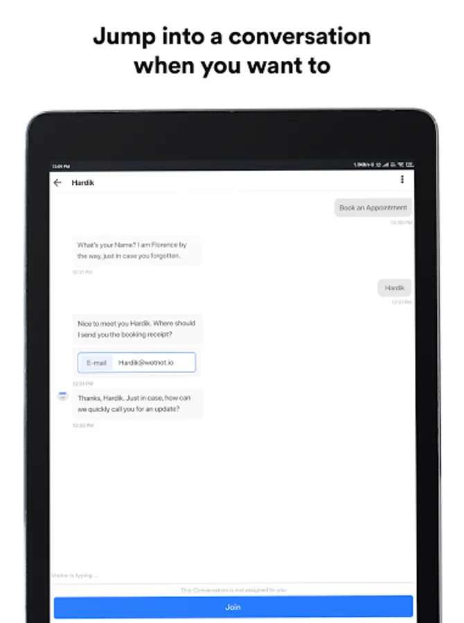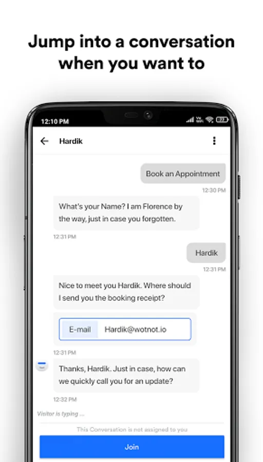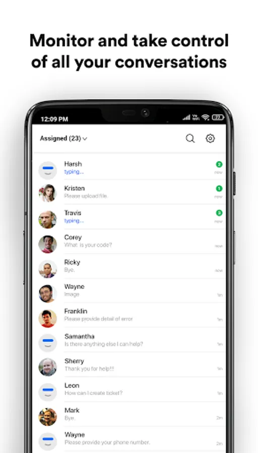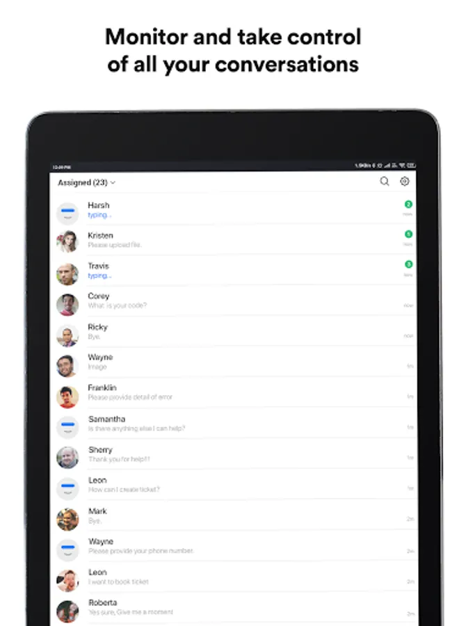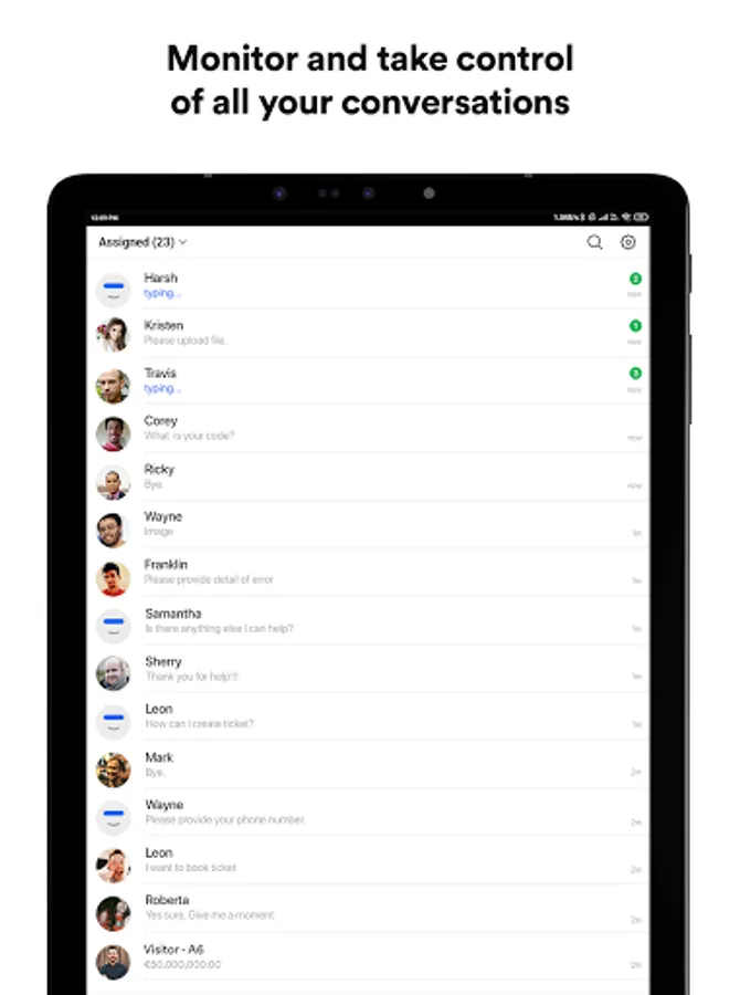 Monitor all conversations handled by your bots and agents in real-time. Seize an opportunity when you see a good lead matching your buyer persona, and seamlessly take control of that chat on the app.
