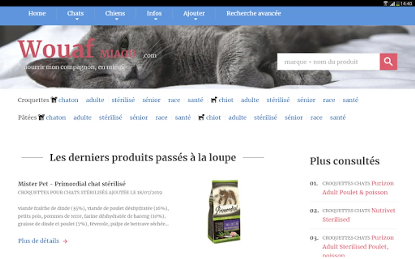 Wouaf Miaou offers Internet users to check the composition of food for cats and dogs. Do you know that it is not recommended to feed the strict carnivore that is the cat with croquettes containing cereals? We help you to better feed your pet by giving you useful information on the composition of its croquettes and pâtés.