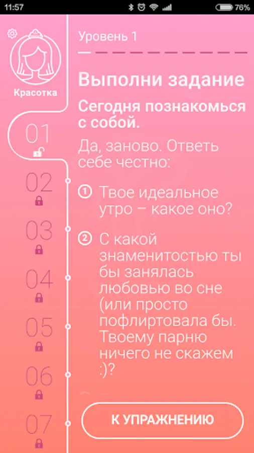 I came up with Vingo! , when postpartum first heard about the problem, which is not to say aloud. It turns out that urinary incontinence affects thousands of pregnant women and women who have given birth. This is due to the weakening of the muscles of the perineum and pelvic floor - they are like any other muscle, you need to develop and strengthen. By the way, for our feelings during sex, they also respond, so Vingo -! Course, a healthy and pleasant in all respects. You notice it in their orgasms and powerful rush of energy and more. Physiology - this is important, but femininity, sensuality, confidence is directly dependent on your attitude to life and to himself. ! That's why in addition to physical exercise Vingo includes daily quests for self-development - simple and interesting, they will help you listen to your desires, to see themselves in a new way and to love. Yes, yes, to love yourself. Only now it is for real. Join and, if you faithfully fulfill all the exercises and activities already in 30 days your muscles will gain tone, eyes shine, and life will be filled with new amazing sensations.