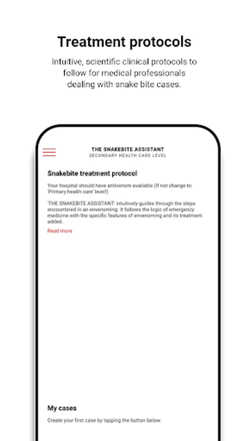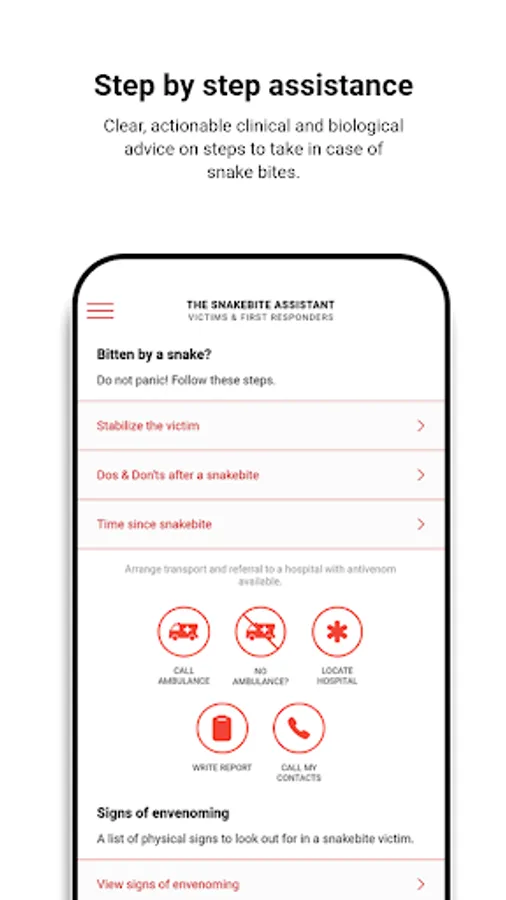 THE SNAKEBITE ASSISTANT’ intuitively guides users through the different stages of envenoming. It follows the logic of emergency medicine with the specific features of envenoming, its identification and its treatment added in.