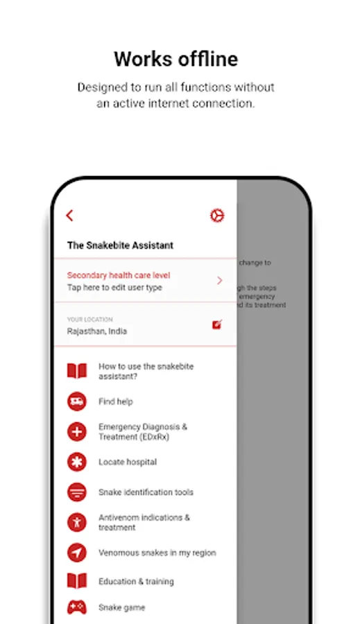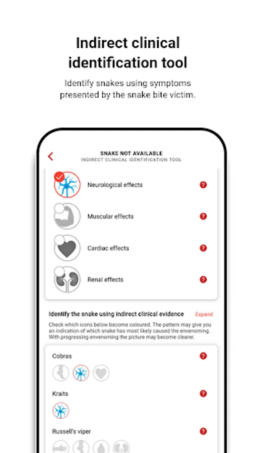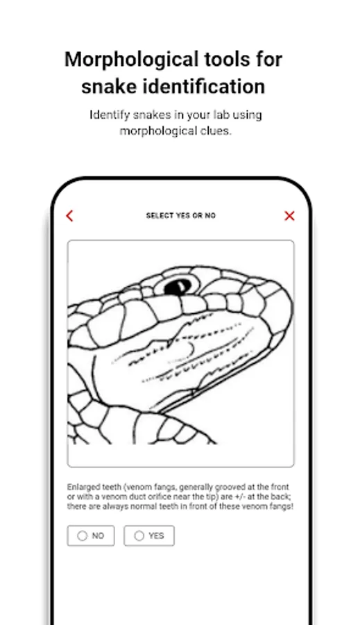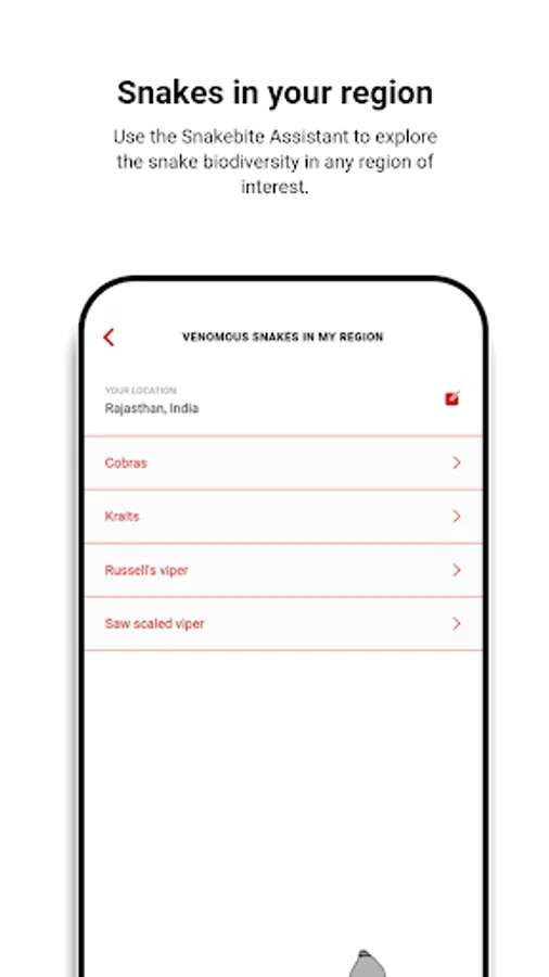 The app fetches information regarding the distribution of venomous snake species in a particular state from its database: the user selects the relevant state and information on the venomous snake species in that state is uploaded onto the user’s mobile device. Species-specific information is essential for selecting antivenoms and preparing for non-specific treatment of species-specific venom effects. A morphological tool enables easy identification of the important venomous snakes.