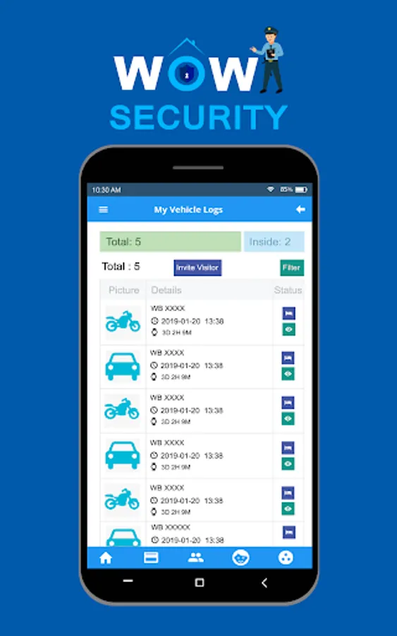 Community members can set a DND (Do not disturb) mode with which no one will be allowed to enter the flat during the specific time. Exceptions can be set for maid, milk man etc. Your vehicle is safe as much as it can. Vehicle owners can set guard on the app after which their vehicle will not be allowed to exit from the housing society. WOW Security is a comprehensive cloud based visitor management system to make housing societies risk free.