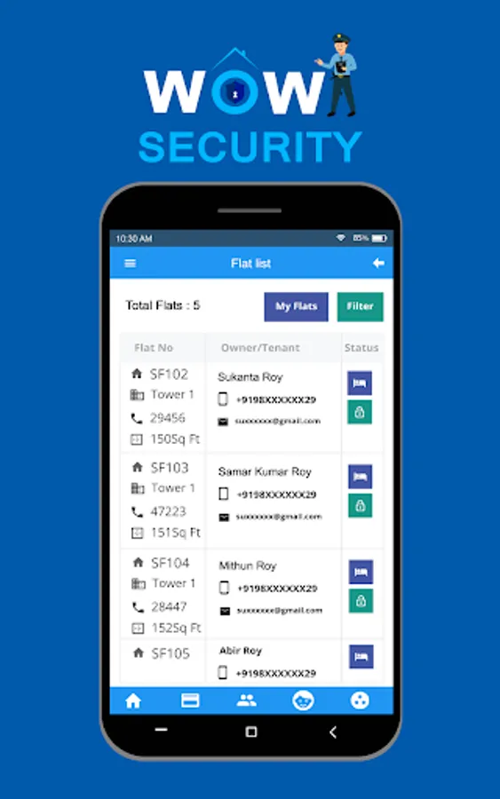 The app saves a lot of time and redundant work. No need for register entries. The security service app enables easy identification and authorization for building residents and their guests. Gate vigilance system also lets you manage your vehicles and tenants for extra layer of security. It’s easy to track all of your visitors with the WOW security app. Just open the application, choose the date and start seeing visitors or guest who entered your premises. Use the App security solution, get stress free from buying registers, storing them or getting inappropriate details. Just use our cloud based housing society management application for complete record.