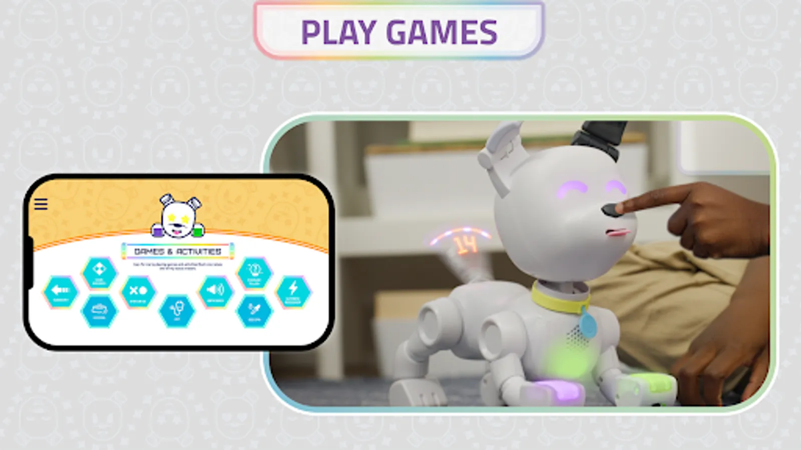 Care for, train, play games and more with Dog-E, your one in a million robot dog. Connect the app to Dog-E via Bluetooth to unlock more ways to play and see Dog-E come to life. Customize your Dog-E even more to make your robot dog totally unique to you.