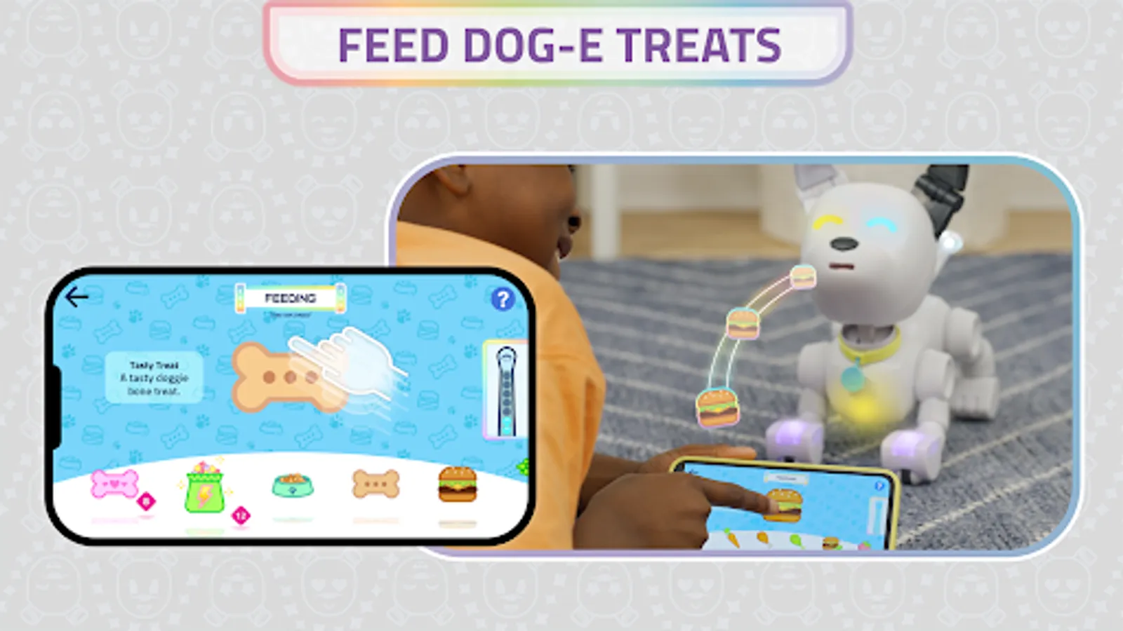 Feeding your Dog-E is even more fun in the app! Hold the app up, and you can “throw” Dog-E treats, and Dog-E eats them. Dog-E will even tell you when it likes a specific treat or not. You can even earn special treats the more you