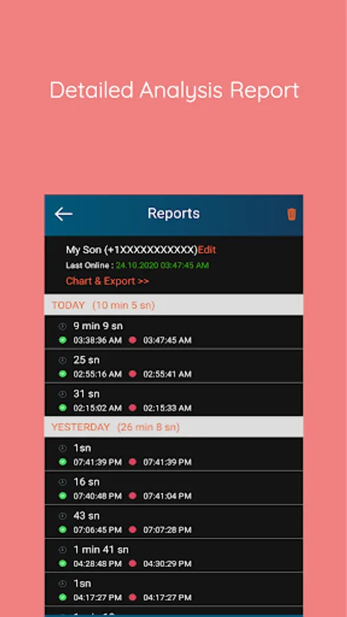 With this whatsapp online tracker application, you can view the time your children are online on Whatsapp in hours, minutes, and seconds. In addition, you can easily see the time spent on WhatsApp and you can also use the instant notification feature when you are online or offline. In addition, by adding your own number to the application, you can check the time you spend on WhatsApp and control your own social media activity.