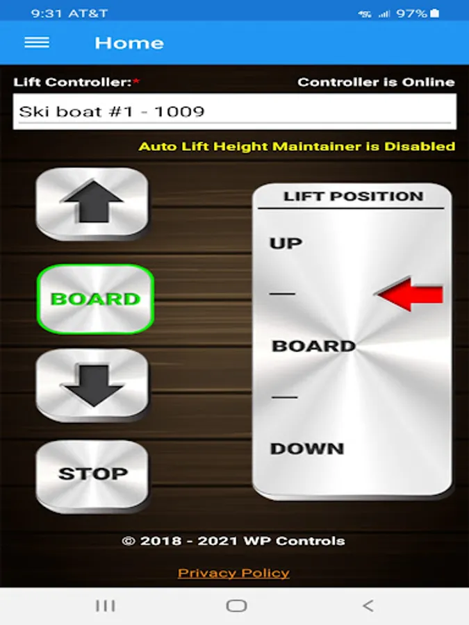 WP Controls Boat Lift Controller App. Enables owners of a WP Controls Boat Lift Controller to remotely control their boat lift with an internet connection. App has camera function, Receptacle remote control, Lift remote with UP, Down and Board positions, Lift position indicator, Bluetooth remote mode, and remote reboot option. The boat lift controller Serial Number must be registered with your account and the lift controller must be connected to a WIFI or ethernet network with internet connection. Bluetooth mode will work without internet connection but you must be within proximity of the lift controller.
