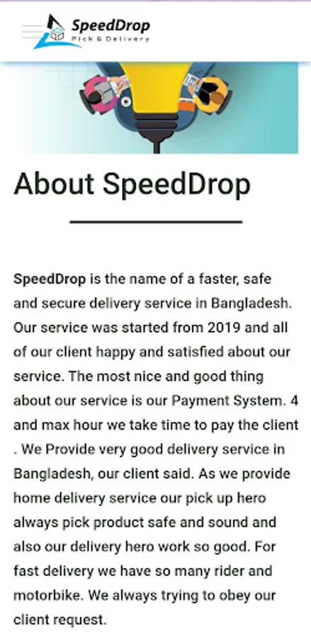 SpeedDrop is the name of a faster, safe and secure delivery service in Bangladesh. Our service was started in 2019 and all of our clients are happy and satisfied with our service. The nicest and good thing about our service is our Payment System. 4 and max hour we take time to pay the client. We Provide very good delivery service in Bangladesh, our client said. As we provide home delivery service our pick-up hero always pick product safe and sound and also our delivery hero work so well. For fast delivery, we have so many riders and motorbikes. We always try to obey our client's requests.