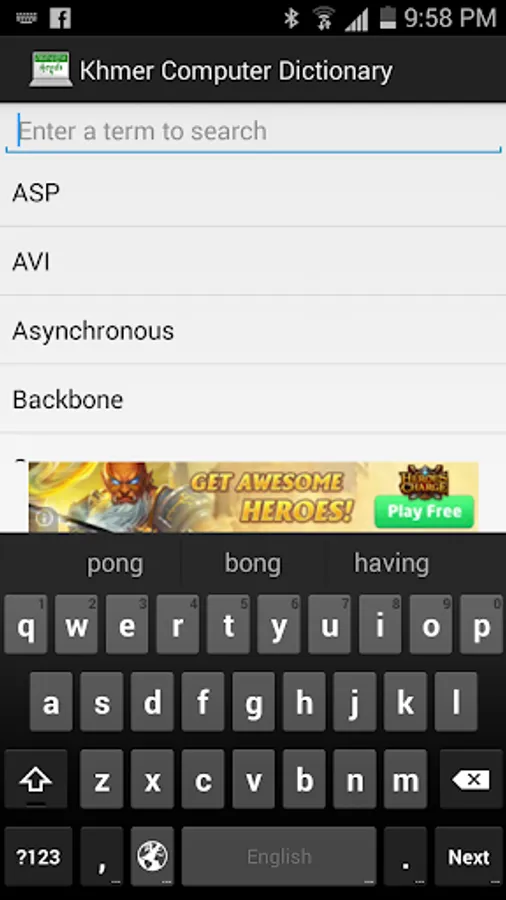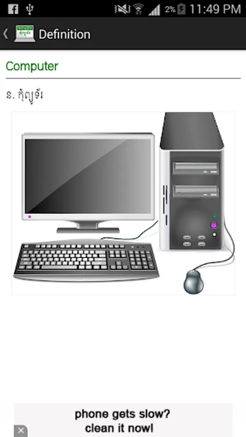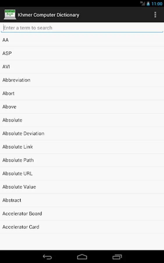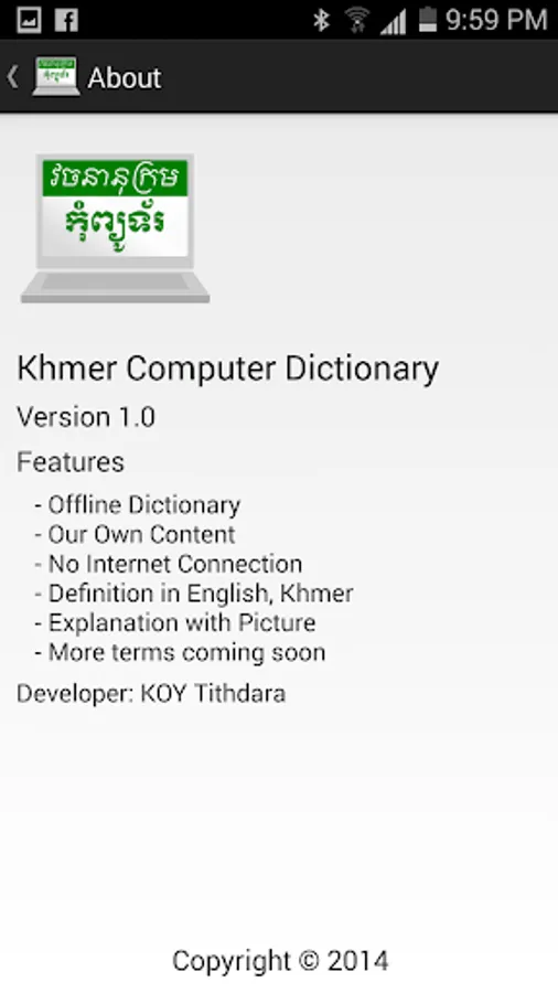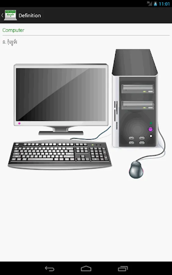 Khmer Computer Dictionary is a first computer terms dictionary that will explain you what the computer term is. It is come with 3 meaning Khmer definition, English definition and pictures based on each term.