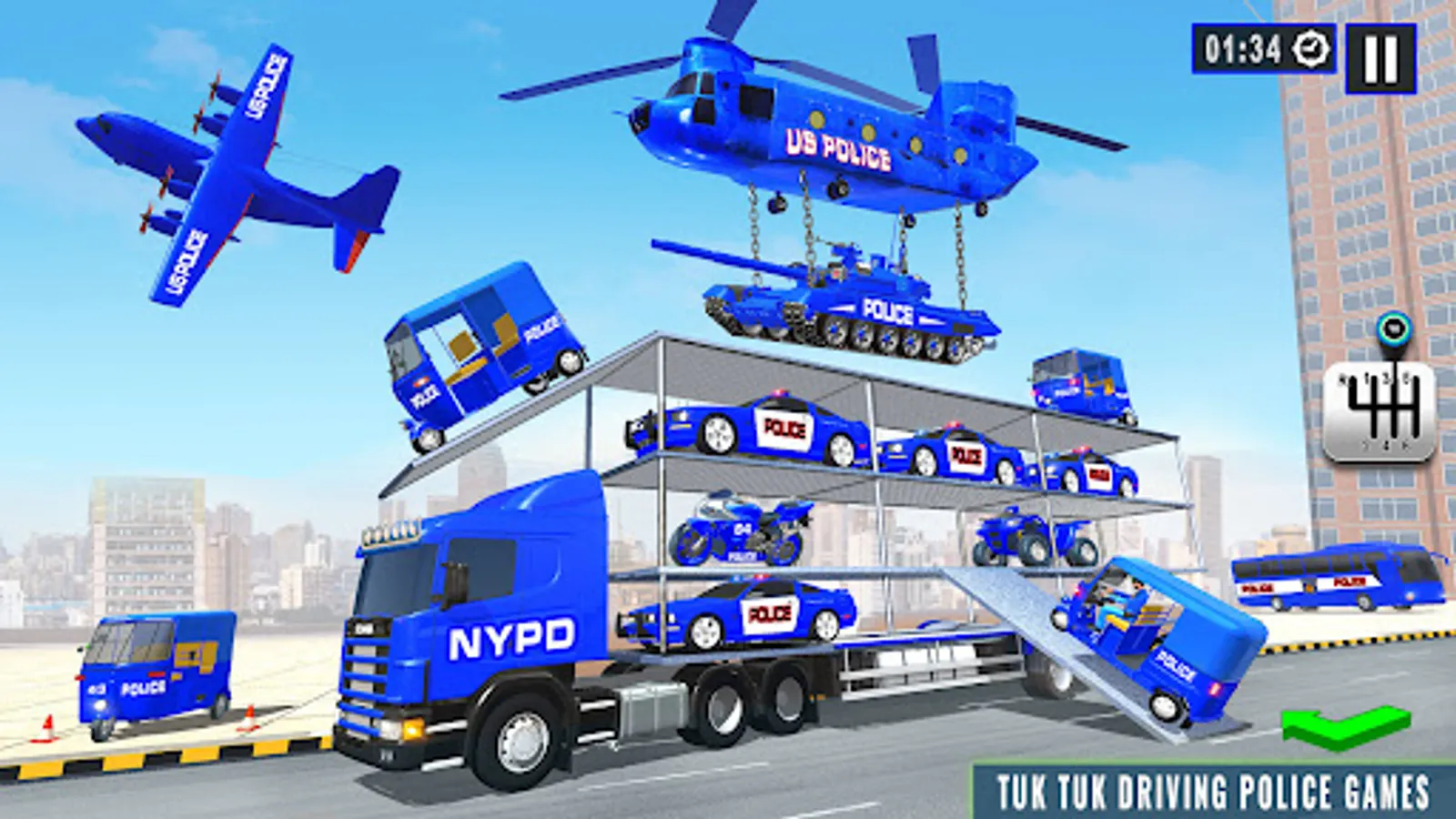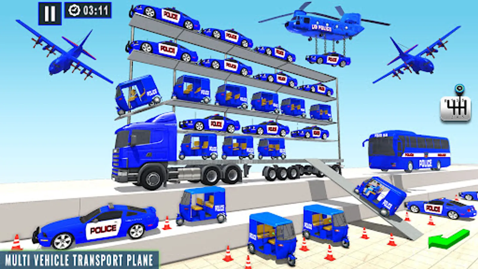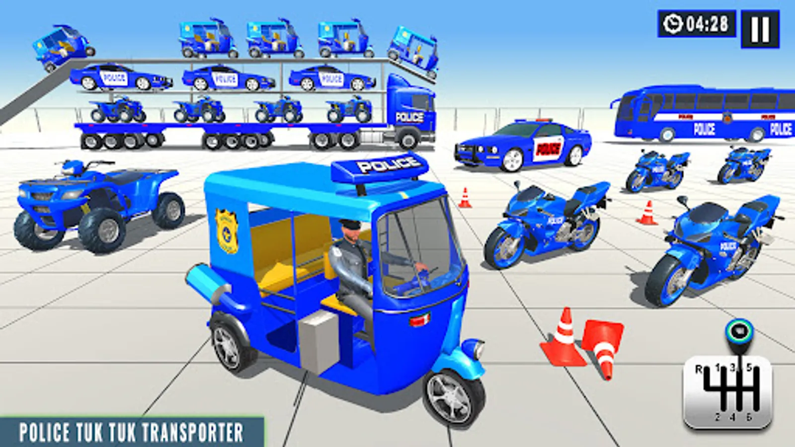 In this Police Transport Driving Simulator Game the city Police cop will be on duty to protect your grand Police Tuk Tuk Transporter Truck from any Police Rickshaw Gangster In the city there are Police Rickshaw gangster who are ready to stole Police Rickshaws from Police Tuk Tuk Rickshaw Transporter Truck. In this Real Rickshaw Driving Game you will pick and drip the Rickshaw from the Police station to their destination. Follow the map and reach your destination in this Police Transport Games . In this Police Transport Games & Auto Rickshaw gangster Chase Simulator Game chases the gangsters and protects the city from them. In this tempo wala & Auto Rickshaw wala Game Drive the Police Auto Transporter Truck in their sheriff modern City Rickshaw Driving Simulator Game. In this Car Transporter Truck Game transport the Police Cargo Transport Truck to carry the US Police Car Game to the Police station. In this 4x4 Police transport truck game load the police tuk tuk rickshaw in the 8x8 police trailer.