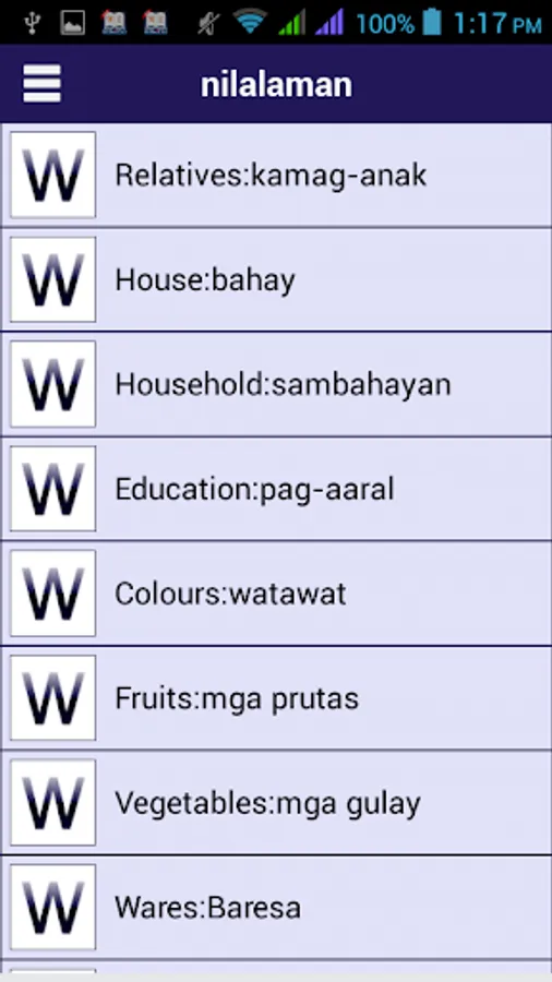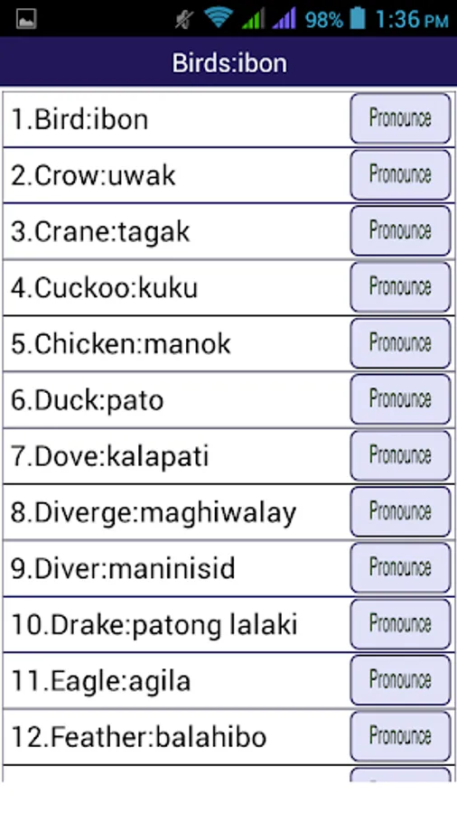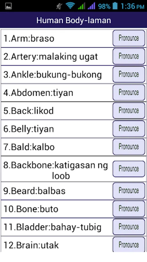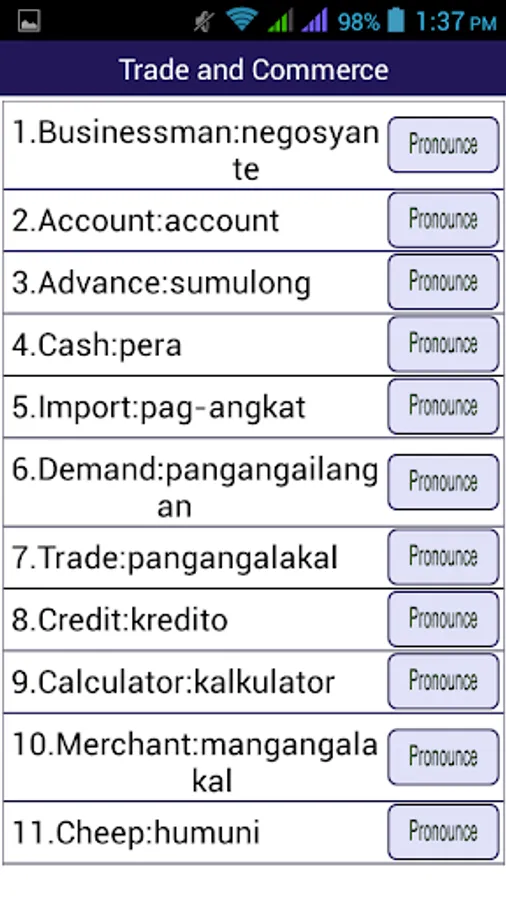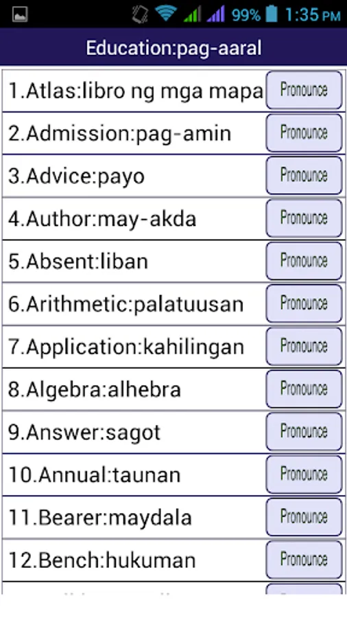 English to Filipino word book with pronounce or sound it is look small pocket dictionary English to Filipino or Filipino to English dictionary.This word book will help you to learn common words or daily necessary words English to Filipino.