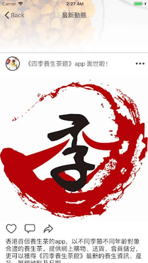 Hong Kong's first Health Tea app, objects of different ages in different seasons appropriate health tea. Providing online shopping, delivery, storage sub-members, more Keyihuode "Four Seasons Health Teahouse" the latest health information, products, place and date of exhibition.