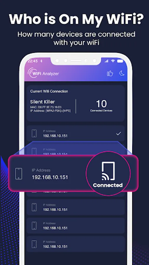✍️ Wifi Monitor – Free wifi analyzer pro, you can check who is on my wifi? Wifi analizer helps you find out how many devices connected your wi-Fi or mobile hotspot. Wifi connection analyzer also show you complete detail of connected network. Wifi Explorer and Wifi Scanner is recommend the strong wifi network and less crowded channel.