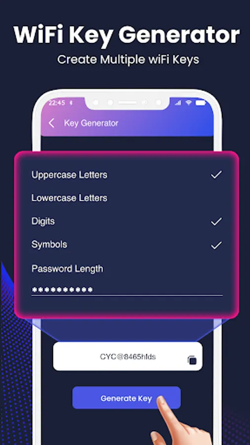 WiFi Analyser - wifi password generator you can generate different WIFI keys for your wifi router and it suggest you to strong WIFI password for your WIFI, so no one can hack your wifi password.