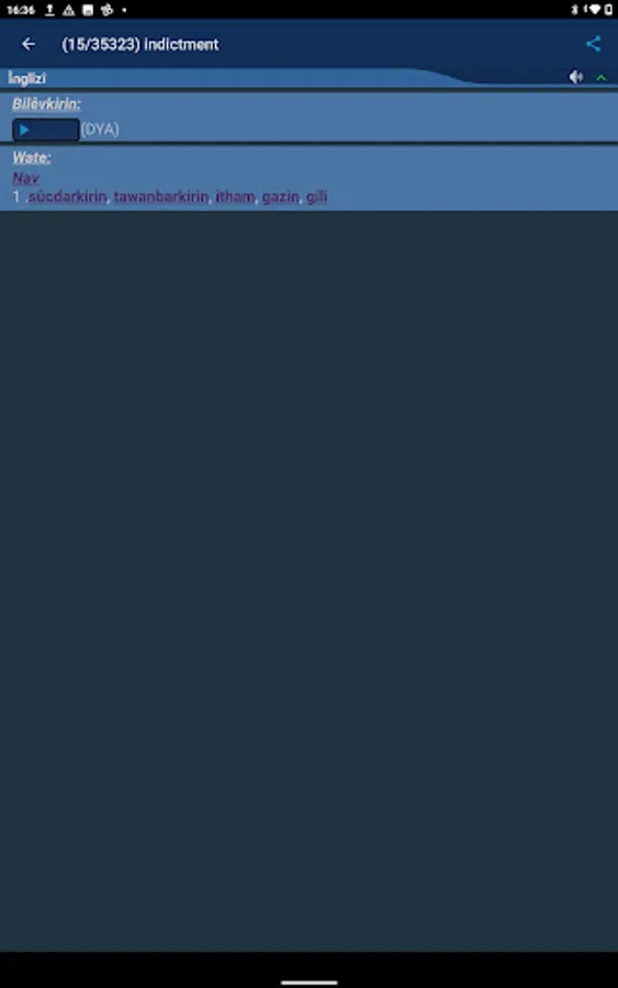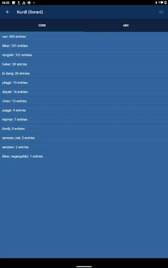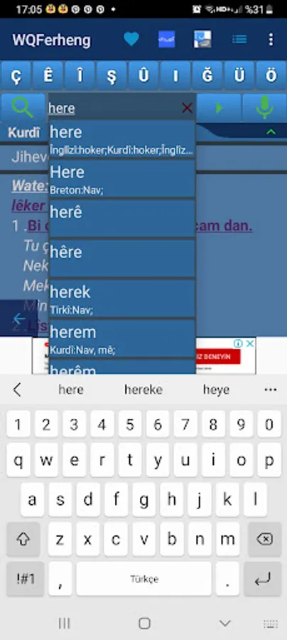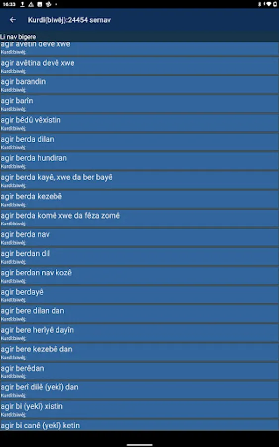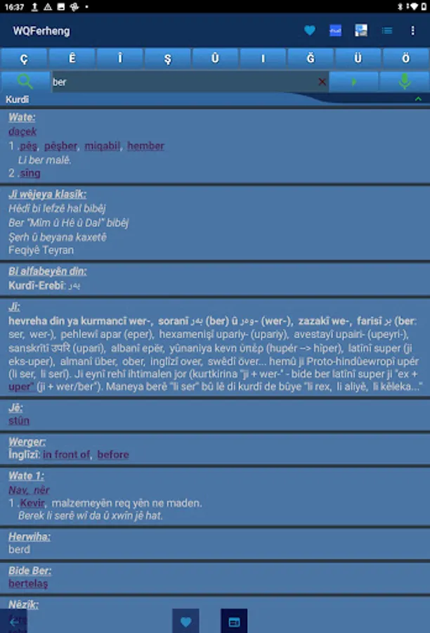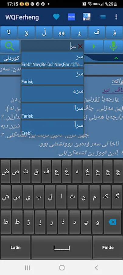 Offline Kurdish dictionary based on Wîkîferheng, Kurdish Wiktionary version. With Kurdish definition of nearly 475.000 articles of more than 260 languages it is far and away the biggest Kurdish dictionary. There is Latin and Arabic Keyboard option, and option for reading articles in Kurdish Latin and Arabic alphabet. Its database from time to time will be synchronized with Wîkîferheng database.