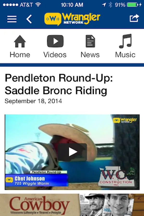 Rodeo, music and video for the Western Lifestyle. Hundreds of video clips and full length broadcasts from the Pendleton Round-Up, George Strait Team Roping, Cody, Reno, San Antonio, Fort Worth, the Wrangler NFR in Las Vegas and many more. Country music from dozens of artists including exclusive performances and interviews.