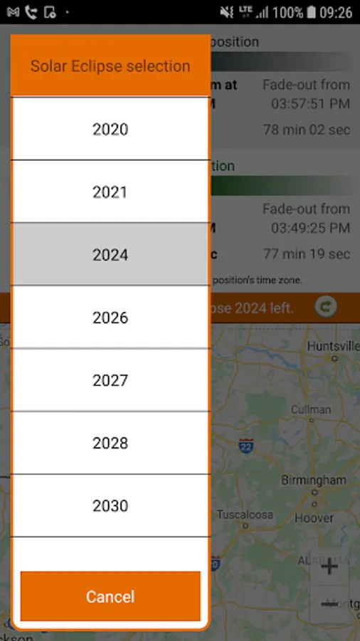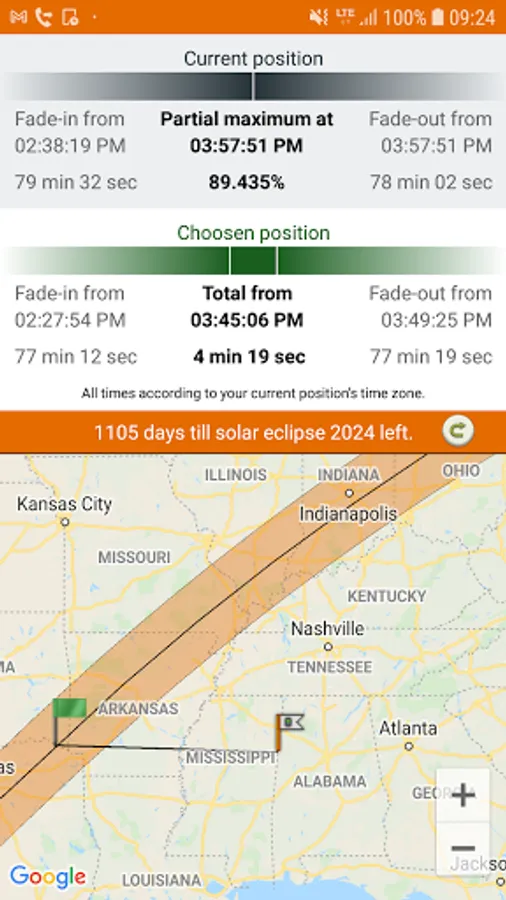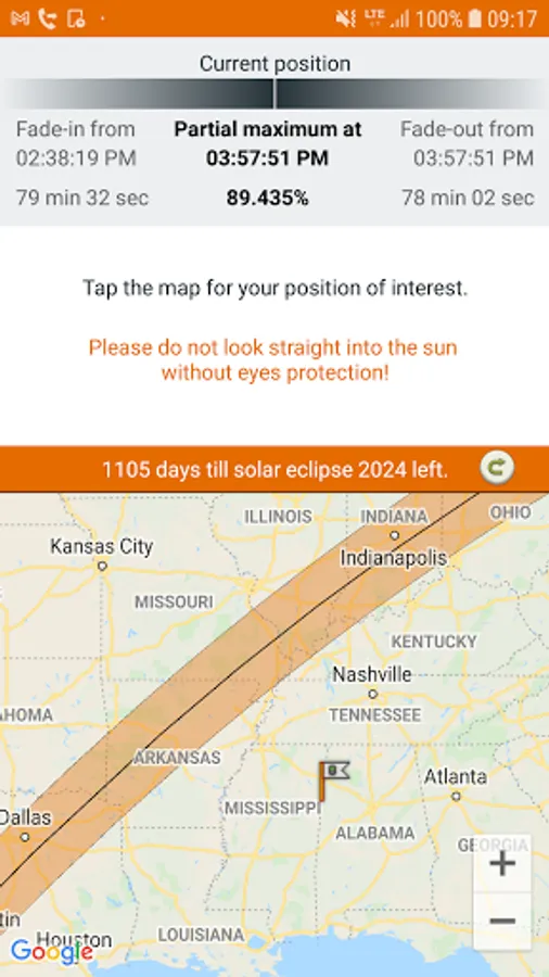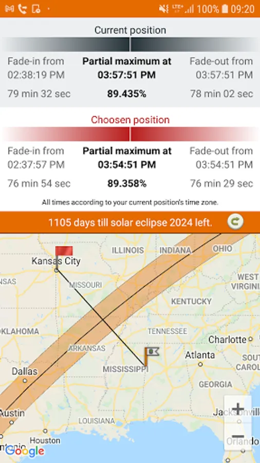 Choose your best position for the solar eclipse, simply by a tap on the map. Compare it with your current location conditions. Green colored flag indicate a better viewing condition, red colored flag means the opposite. Find out start time and duration of the partial or total eclipse for both positions. For planning choose the requested total solar eclipses (2017/2019/2020/2021/2024/2026/2027/2028/2030) simply by tap on the information line - orange color in the middle of the screen.