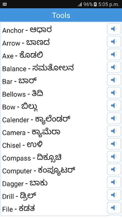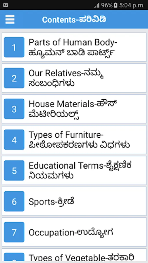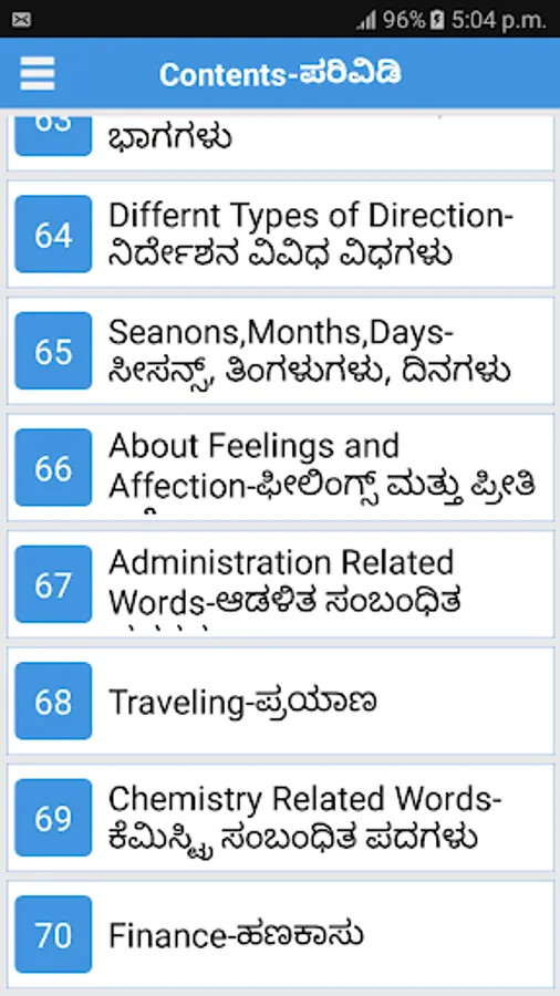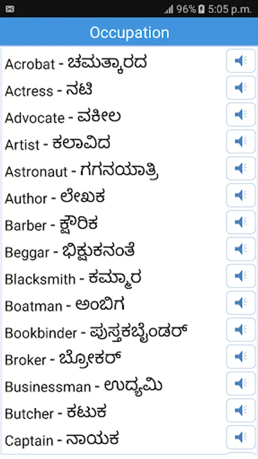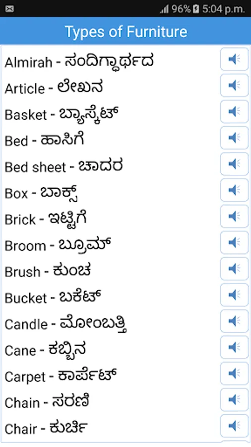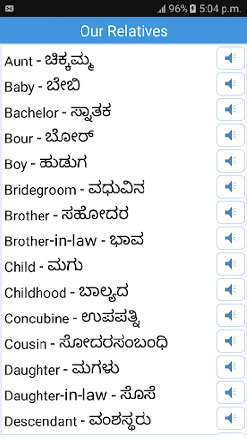 This English to Kannada Daily Words with sound help you to learn English.This Daily Words also help to learn English to Kannada Translation and spoken in English. Here you also get most common daily necessary vocabulary.