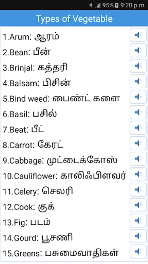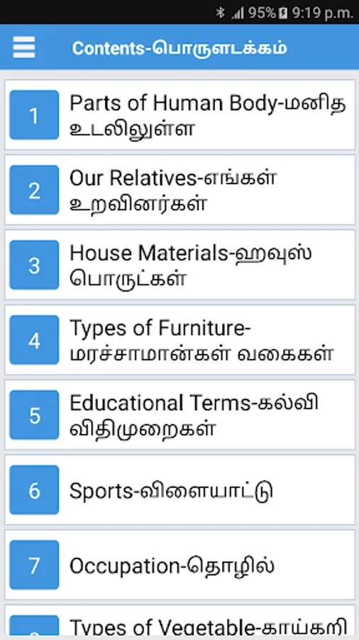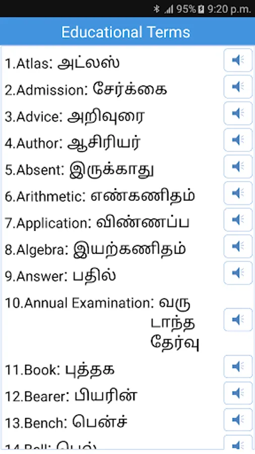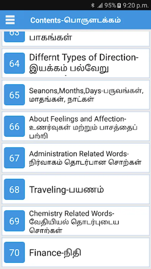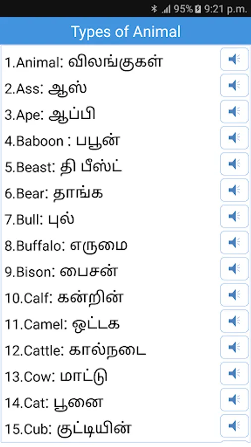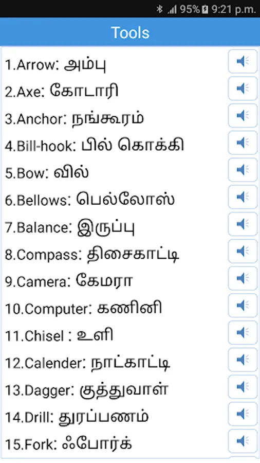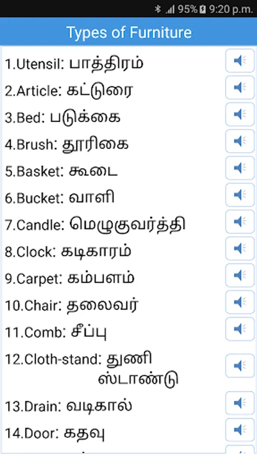 This English to Tamil Daily Words with sound help you to learn English.This Daily Words also help to learn English to Tamil Translation .It help you to speak in english. Here you also get most common daily necessary vocabulary .