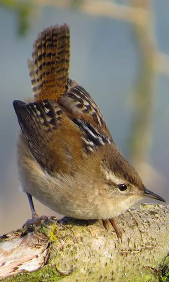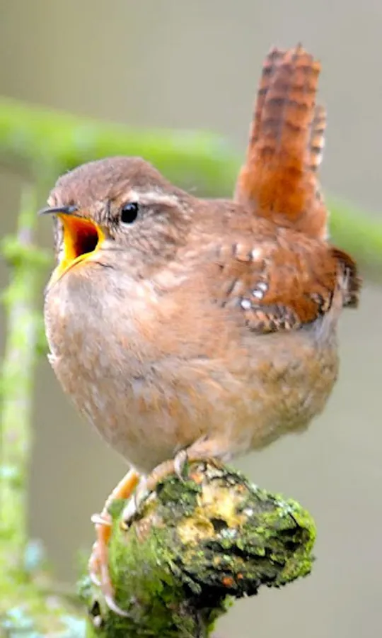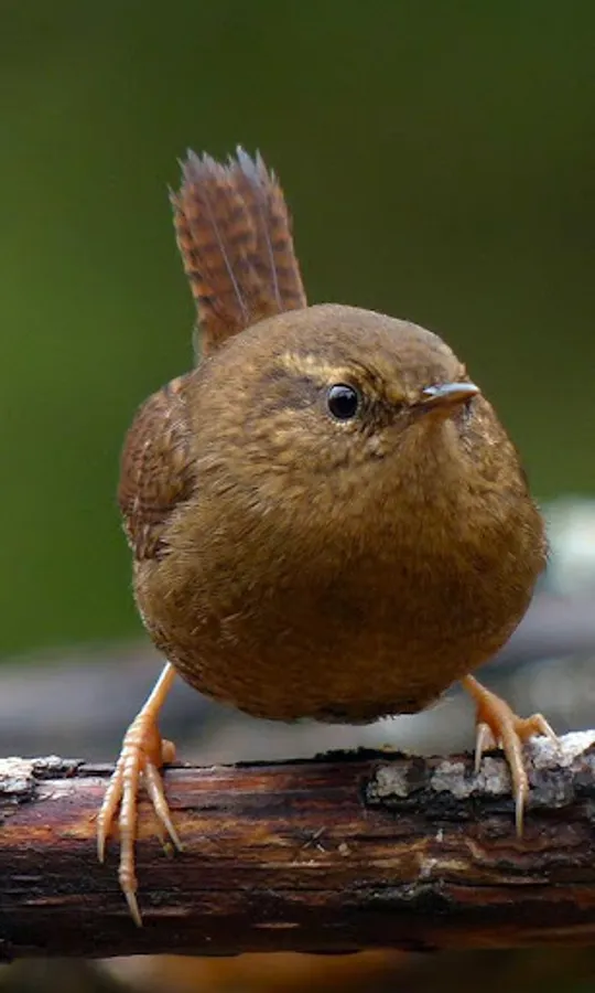 Wren one of the smallest European birds its length is only 9-10.5 cm which is almost half the house sparrow a wingspan of 15-17 cm and a weight of about 8-12 g Build dense with a short neck and a big head. Feathering is soft fluffy in the upper body reddish-brown the bottom brownish gray. Throughout the body there are transverse dark wavy grooves which are most pronounced in the primary wing feathers of the first and second order of wings and coverts of the tail which is why the body seems to be striped. The wings are short and rounded. Tail also disproportionately short and often upturned vertically upwards. The eyebrows visible white stripes of feathers sometimes not clearly expressed. Legs very strong pinkish color. Males and females in appearance from each other does not differ. Young birds are also significant differences are not although they have at the back is dominated by rust-red tones and on her head feathers are light brown with dark kaomkami on the tops of which adult birds are not expressed.