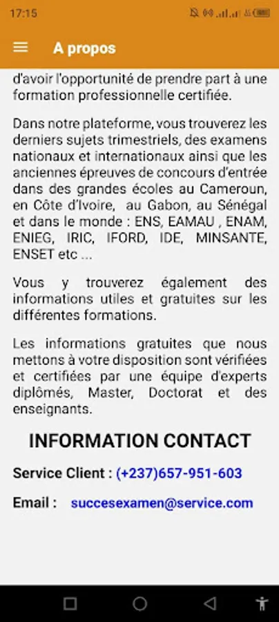 In our platform, you will find the latest quarterly subjects, national and international exams as well as the old entrance exams to major schools in Cameroon, Côte d'Ivoire, Gabon, Senegal and around the world: ENS , EAMAU, ENAM, ENIEG, IRIC, IFORD, IDE, MINSANTE, ENSET etc ...