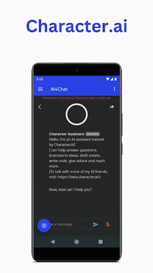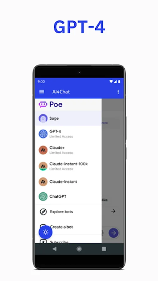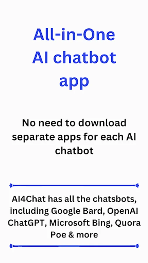 Note: AI4Chat just provides access to Google Bard, OpenAI's ChatGPT and GPT4, Microsoft's Bing Chat, Anthrope's Claude, Character.ai and Quora's Poe, but we are not affiliated with any of these companies. We simply make it convenient to use all these services under one app by providing access to their web interfaces. You may or may not have to create an account on these AI websites to access the chatbots. However, you don't need an account to use AI4Chat. Our app is completely free to use.