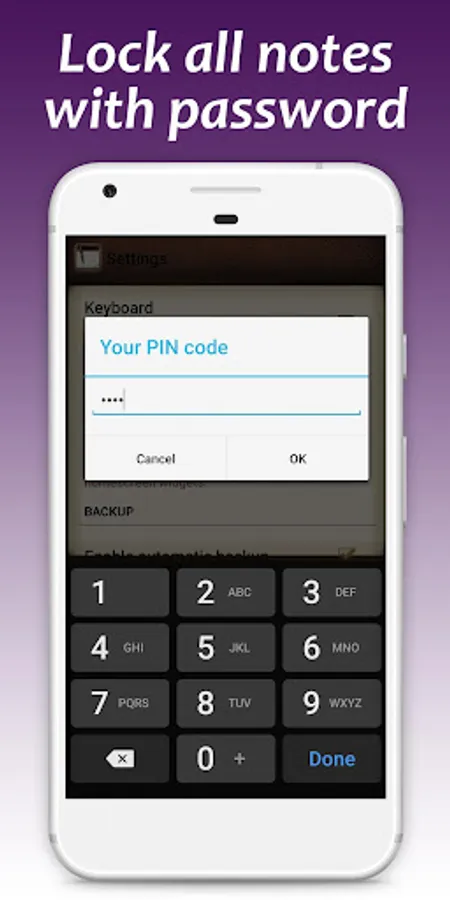 In this safe notes app you can keep notes protected by setting a PIN for notes with password. This way if you have locked notes every time you wish to use the note taker, you’ll have to enter a code. Your locked notes with password are safe from any unwanted readers. To set a new PIN code go to the menu, settings, enable PIN code.