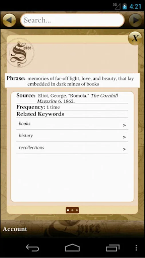 A paid subscription to Spice Mobile enables on-the-go access to our revolutionary phrase thesaurus. This writing aid has a user-friendly layout that includes interactive graphs and timelines to help you track the use of each phrase through time! Our phrase thesaurus is changing continually as we add clever phrases, fresh keywords and updated source information.