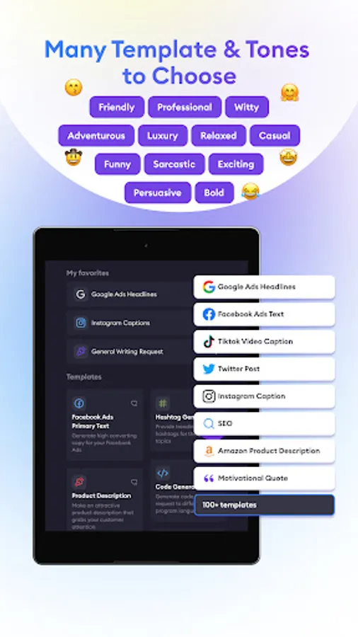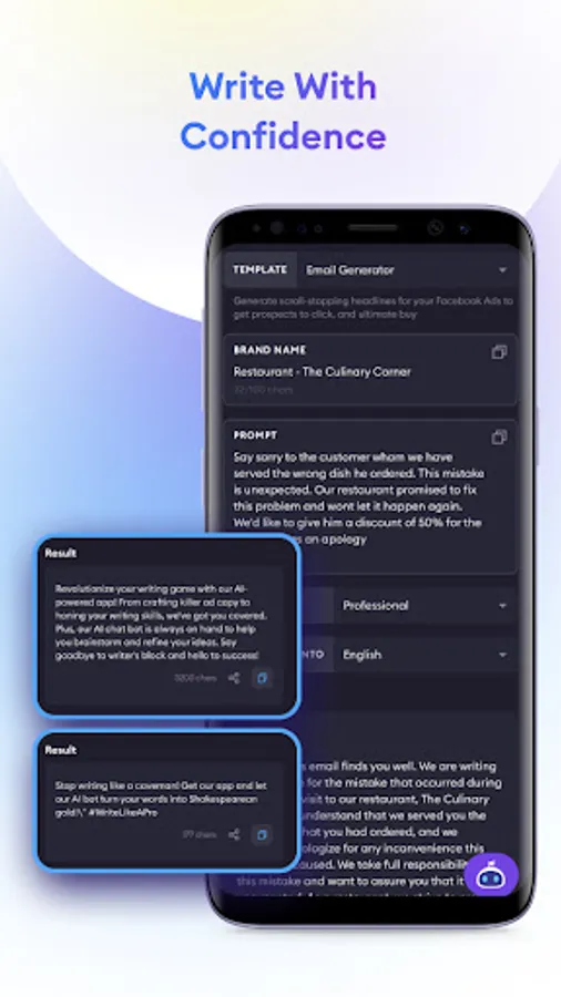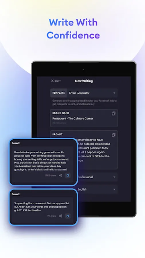 Whether you're a professional writer, a student, or just someone who wants to improve their writing ability, this app is perfect for you. With a wide range of templates available, you can easily write essay on any topics, content for SEO, ads content (Google, Facebook, Tiktok,...) , social media, and many more. The app also provides support for professional writing skills, essay writing, email writing, and other writing styles. Our app is designed to help you write better, faster, and more efficiently. With our advanced writing AI, you can improve your grammar, syntax, and vocabulary. You can also use our templates to create content that is optimized for search engines, social media, communication and other platforms. Whether you're a beginner or an experienced writer, our app is the perfect tool to help you improve your writing skills.