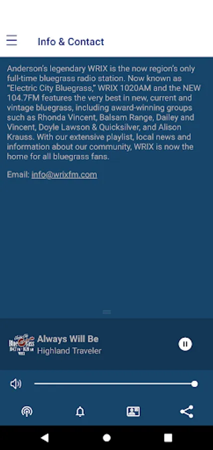 Anderson’s legendary WRIX is the region’s only full-time bluegrass radio station. Now known as “Electric City Bluegrass,” WRIX features the very best in new, current, and vintage bluegrass, including award-winning groups such as Rhonda Vincent, Balsam Range, Dailey, and Vincent, Doyle Lawson & Quicksilver, and Alison Krauss. With our extensive playlist, local news, and information about our community, WRIX is now the home for all bluegrass fans.