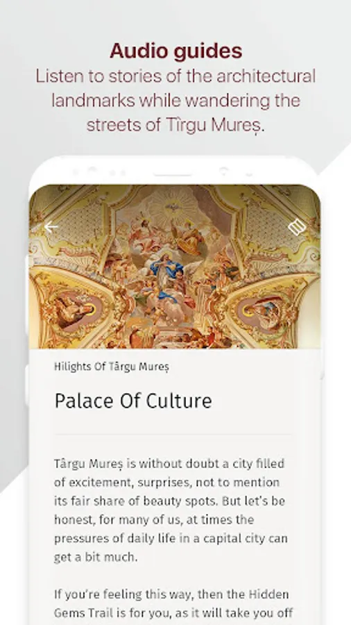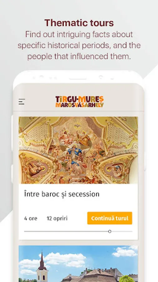 All the trails in the app revolve around a main theme. If you want to know as much as possible about Tîrgu Mureș, go for the tour of all the city’s landmarks. In case you are interested in Baroque or Secession architecture, you can try the Baroque or the Secession tours of the town. If you want to find out facts about the diverse religious background of Tîrgu Mureș in past centuries, you should opt for the Tour of Religious Landmarks. And last but not least, if your schedule allows you to see only the most important spots, choose the Highlights of Tîrgu Mureș.