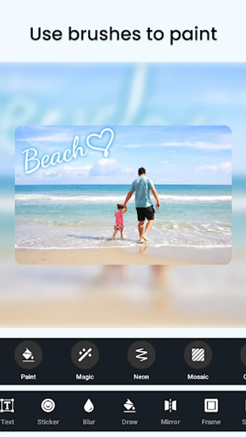 • Draw on your photo with different options like Paint color draw, Magic brush, Neon, Mosaic, Color draw