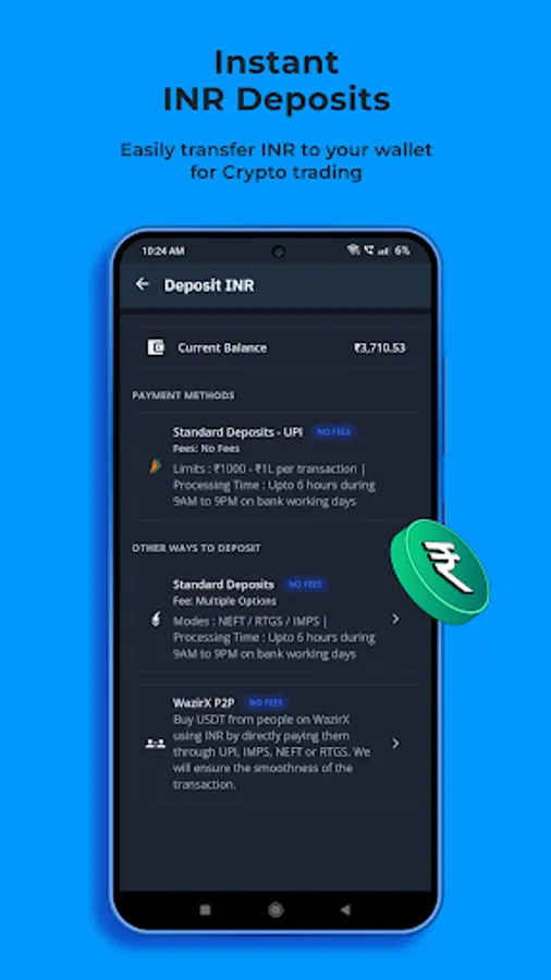 • Buy Bitcoin and other cryptocurrencies by instantly depositing INR via UPI or IMPS.