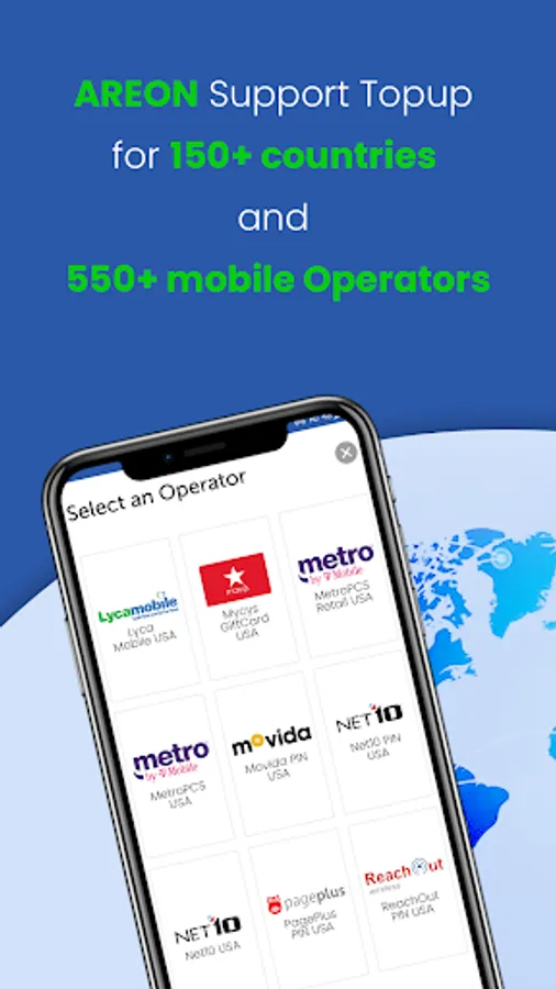 We support 185 Countries and 450+ Mobile operators.With AREON Online mobile recharge app you can instantly top-up / recharge your mobile phone, top-up / recharge your data card or recharge of your DTH is just a few clicks. You can send airtime ( viz popularly known as load / mobile recharge / top-up / airtime / refill ).