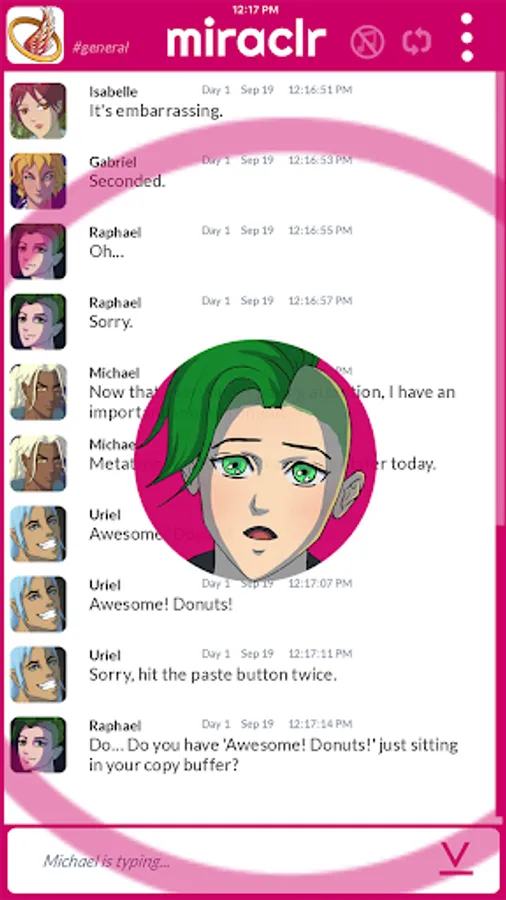 miraclr is a comedic workplace romance starring the biblical (and apocryphal) archangels, told in a mobile office collaboration app.