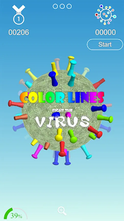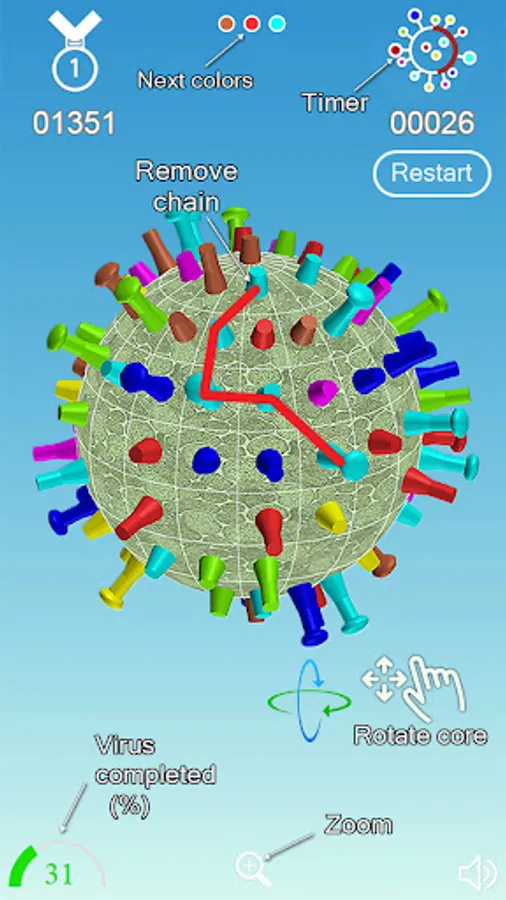 Fight the virus! Its crown is constantly growing, it is necessary to rotate the core and find chains of spikes of the same color and destroy them. Chains can be searched in adjacent cells in all directions.