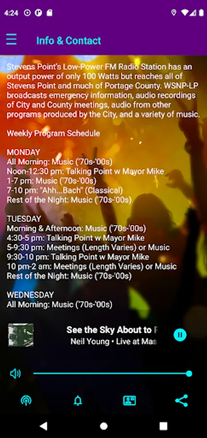 The station can broadcast emergency information, broadcasts audio recordings of City and County meetings, audio from other TV programs produced by the City, and plays a variety of music at all other times.