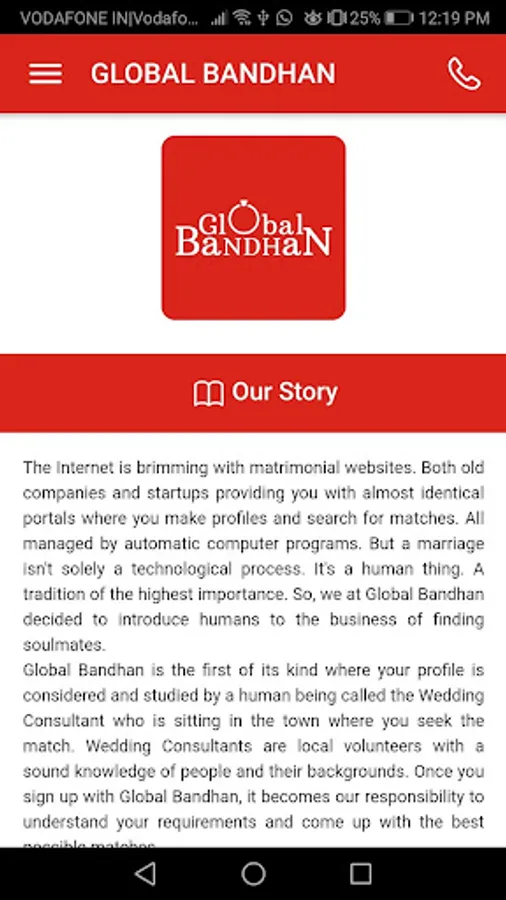 Global Bandhan is the first of its kind where your profile is considered and studied by a human being called the Wedding Consultant who is sitting in the town where you seek the match. Wedding Consultants are local volunteers with a sound knowledge of people and their backgrounds. Once you sign up with Global Bandhan, it becomes our responsibility to understand your requirements and come up with the best possible matches.