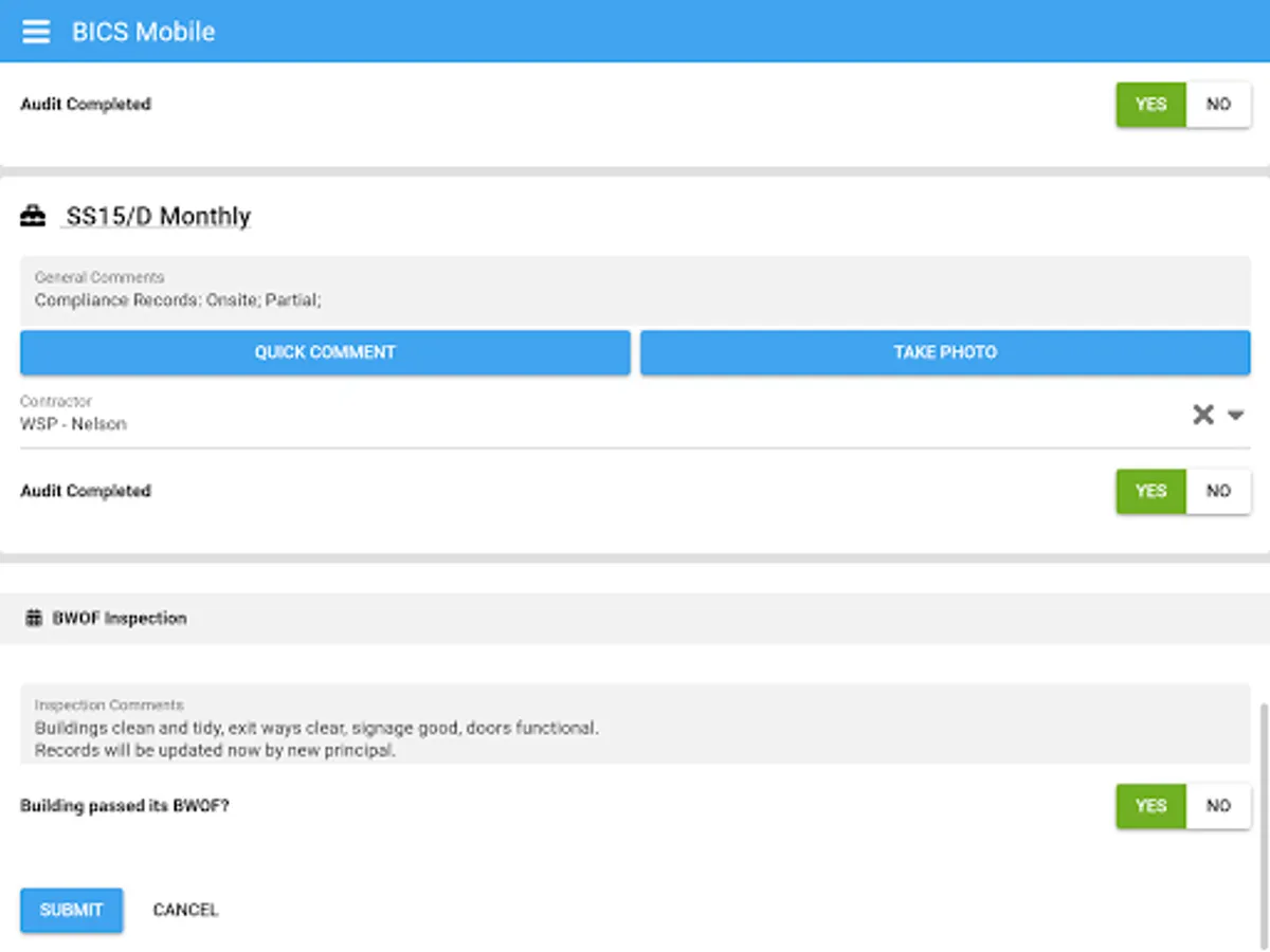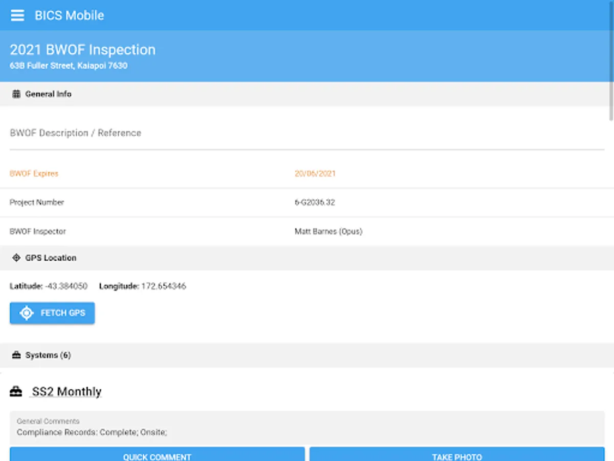 BICS Mobile is a mobile companion application used by our on-site inspectors when carrying out WSP Building Warrant of Fitness (BWoF) inspections.